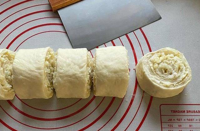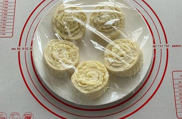3. Скатать в рулет, края защипать. Следить, чтобы рулет был одинаковый по всей толщине. Рулет разрезать на 10 равных частей. Затем сложить на блюдо, затянуть пленкой, убрать в холодильник на 30 минут, чтобы масло охладилось и застыло. В холодильнике тесто немного подойдёт.