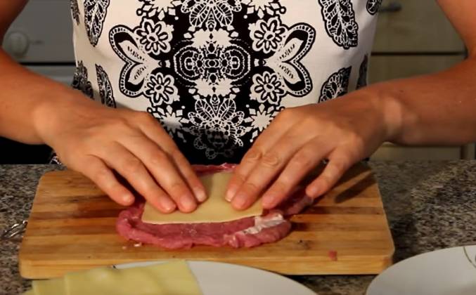 2. И вот так закрываем, можно немножечко завернуть. Все мясо должно получиться вот такой формы. Наше мясо уже сформировано. Теперь берем и взбиваем яйцо. Теперь наше мясо обмакиваем во взбитом яйце хорошенечко и обволакиваем в сухарикиках, чтобы везде равномерно покрыли они. Лишние струсим. Все это укладываем на разогретую сковородку и жарим на среднем огне под крышкой. Когда положили мясо, бросаем розмарин. Он сразу дает просто такой изумительный аромат!