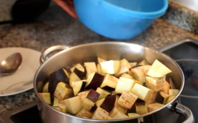 2. Баклажанчики закипели и с момента закипания 5 минуток провалились на среднем огне. Теперь я их достаю на дуршлаг и даю им стечьот водички. Теперь я баклажаны выворачиваем в миску и оставляю остывать до полного остывания. Баклажаны уже полностью остыли. Берем емкость, в которую мы сложили зелень и чеснок и высыпаем туда баклажаны. Теперь сюда мы выливаем подсолнечное масло. И хорошенько все перемешиваем. В салат зелень старайтесь резать как можно мельче.