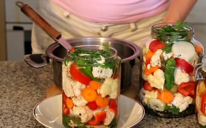 2. Дальше просто в перемешку укладываем все наши овощи какие есть и так доверху . Вот такая вот простая красота у меня получилась. Видите все уложила и переложила, чтобы были все разные цвета. Теперь мы приступаем к изготовлению рассола. В кастрюльку выливаем водичку. Сюда же высыпаем соль и сахар. Все это доводим до кипения. Наш маринад закипел, теперь мы крутым кипятком заливаем наши овощи до самого верху. Теперь вы обязательно должны прикрыть крышечкой наши баночки.