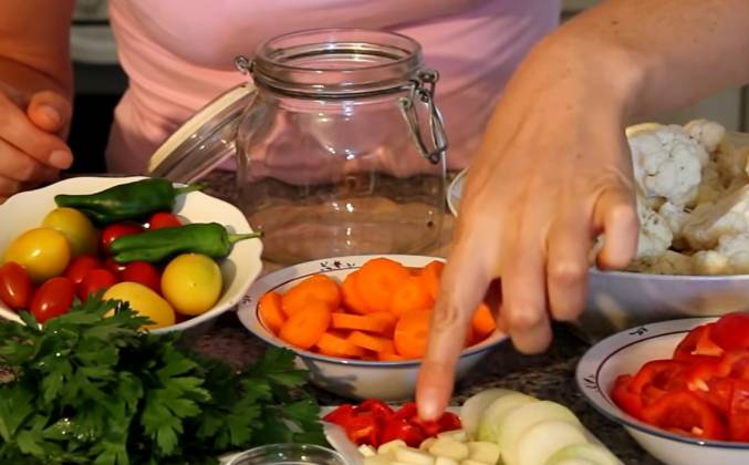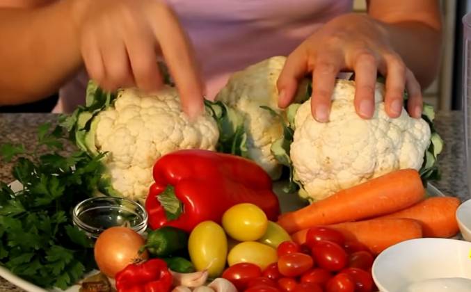Квашеная цветная капуста хрустящая. Сейчас у нас на горячая пора заготовок на зиму овощей и фруктов. Сегодня я покажу как можно заквасить очень вкусно цветную капусту. Для этого нам необходимо: цветная капуста, сладкий перчик ,морковка, помидорчики черри, чесночок, сюда же можно использовать маленькие огурцы, перчики разные. Можно добавить острый перчик, но это по желанию! Лавровый листик, чуть-чуть лучка ,зелень, перец горошек, сахар, соль и водичка.
