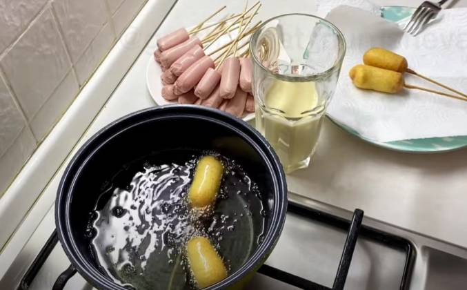 3. Затем жарим в раскаленном масле. Чтобы было удобнее макать, я перелила тесто в стакан. И так жарим все сосиски. Друзья, наш Корн дог готов. Готовится легко и из доступных ингредиентов.