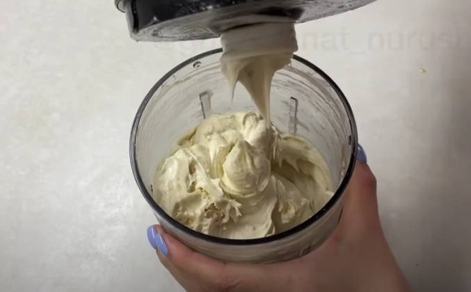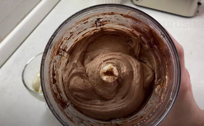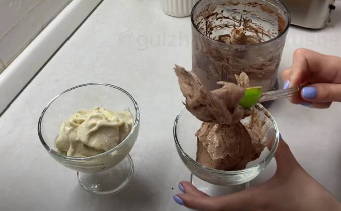 2. Поэтому помогаем ложкой и хорошо измельчится. Посмотрите, когда измельчите в блендере, консистенция станет густой, похожая на мороженое. Наше мороженое готово. Очень легко готовится. Если хотите получить мороженое разных цветов, то можно добавить ягоды. Например, добавите клубнику или малину, то будет красный цвет. Я добавлю какао. Одну половину положила в стакан, в другую добавлю чайной ложки какао. Еще раз измельчаем в блендере. У нас получится шоколадное мороженое. Мне больше понравился этот вкус.