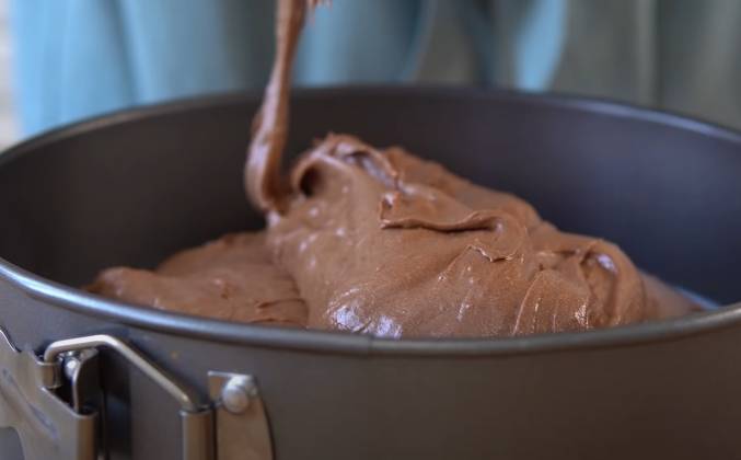 3. Дно формы диаметром 22-24 см (у меня 22см) застилаем бумагой для выпечки, при необходимости можно смазать сливочным маслом. Аккуратно распределяем тесто, отправляем в заранее разогретую духовку 170 градусов примерно 40 минут, в зависимости от размера формы и духовки. Готовность проверяем деревянной палочкой, она должна выйти сухой. Готовому бисквиту даем остыть в форме, потом аккуратно вынимаем, переворачиваем и снимаем бумагу, чтобы испарилась лишняя влага. Полностью остывший бисквит разрезаем пополам на две части.