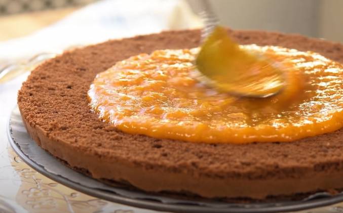 4. Распределяем примерно половину горячего джема, накрываем сверху вторым коржом и также хорошо промазываем верхушку и бока. Убираем в холодильник минимум на час, чтобы все схватилось. Охлажденный торт покрываем горячей глазурью, даем схватиться и потом делаем надпись (по желанию). Глазурь классическая: В сотейнике соединяем сахар, воду, ставим на огонь, как закипит добавляем 200 грамм горького шоколада (поломать на кусочки), помешиваем, чтобы он начал плавится.