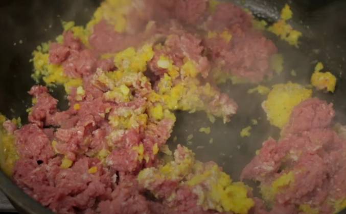 3. Фарш готов, можно выключать. Соус бешамель Обжарить муку в сливочном масле. Постоянно помешивая ввести молоко. Когда половину молока хорошо размешали с мукой добавляйте оставшееся. Нагрев держать между средним и минимальным. Соус посолить, добавить немного черного перца и 1/4 чайной ложки мускатного молотого ореха. Варить до загустения. Вытащить из духовки запеченные баклажаны и снизить температуру до 180-190°С градусов.