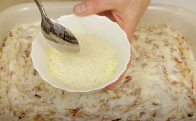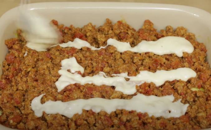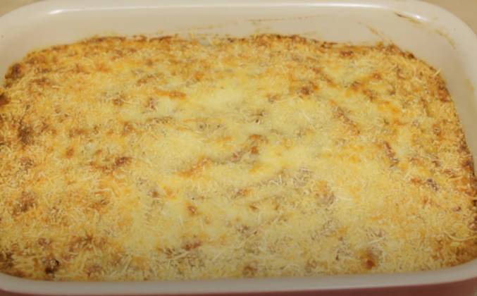 4. СБОРКА МУСАКИ. Смазать форму маслом. Нижний слой - картофель. Сверху баклажаны. На баклажаны вылить половину соуса. Потом кабачок. Мясной фарш и оставшийся соус. Посыпать мусаку сверху натёртым сыром. Я добавляю в сыр ложку панировочных сухарей. Отправить форму в духовку на 30-35 минут.