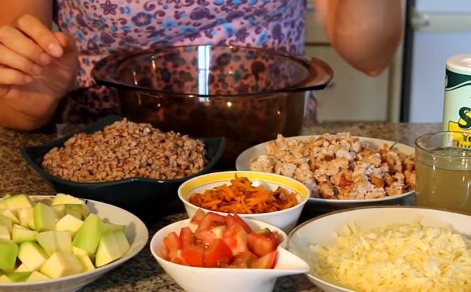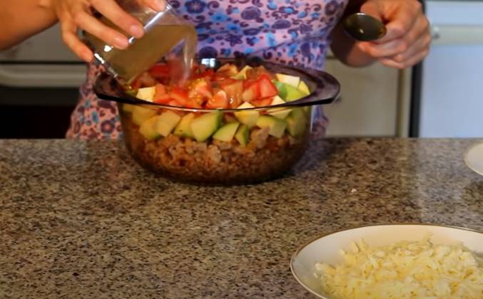 2. Сварить до готовности (можно чуть чуть не доварить) гречку. Помидор порезать достаточно крупным кубиком. Очистить и порезать кубиком кабачок. Обжаренный фарш вот такого золотистого цвета. это у нас зажарка из морковки и лука. Нарезанные помидоры. Очищенные и нарезанные кубиком кабачки, видите достаточно большими кубиками и готовая гречка. Сейчас мы будем формировать уже нашу запеканочку. Для этого оно необходимо переложить первым слоем гречку.
