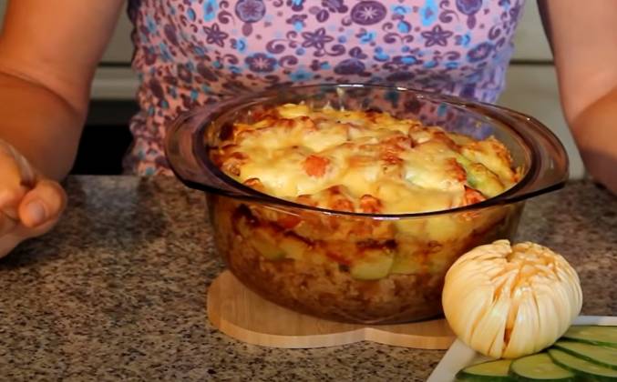 3. Все это разровнять. так теперь сюда же мы высыпаем наши кабачки и опять разравниваем. И сюда же помидорки. Наши овощи желательно немножко посолить по желанию. Теперь заливаем бульон или водичку. Все это присыпаем сыром и вот теперь наше произведение мы отправим в разогретую до 250 градусов духовку минут на тридцать, чтобы наш сыр хорошо зарумянился. се отправляем в духовку. И вот наше блюдо спустя тридцать минут.Видео рецепт ютуб ниже 👇