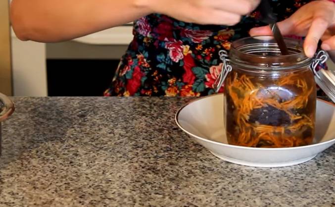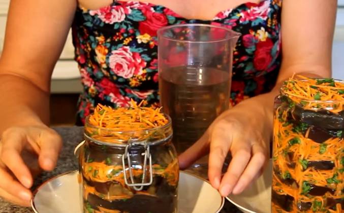 3. Все это очень хорошо перемешать. Получилась такая вкуснота. Теперь разрезаем баклажаны минимум на две части вот таким образом. Но мне больше нравится, когда они разрезаны на четыре части. Их удобнее складывать в емкость. Так делаем со всеми баклажанами. Теперь плотненько перекладываем слоями в баночку или другую емкость. Первый слой у нас морковочка и потом баклажанчики. И так до верха банки. Очень плотно утрамбовываем. Такие симпатичные баночки у меня получились. Теперь сюда я заливаю наш маринад. Очень осторожно, доверху.