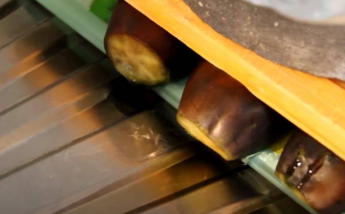 2. Дальше мне потребуются вот такое приспособление под наклоном. Сюда я аккуратненько выложу баклажаны и придавлю прессом. Нужно добиться вот такого эффекта, чтобы с нашей баклажанчиков начал выходить сок. И так где-то 1-2 часа. Такими стали плоским наши баклажанчики. Теперь мы приступаем к маринаду. Для этого нам надо соль, смесь перцев и лавровый лист. Все ссыпать в баночку и залить кипятком. Размешать до растворения соли и подождать до полного остывания. Делаем начинку. Для этого нам надо очистить морковку и натереть на терке. Можно на крупную терку, но я буду натирать на тёрку для корейской морковки. Мелко нарубить зелень и через чесночницу выдавить чеснок.
