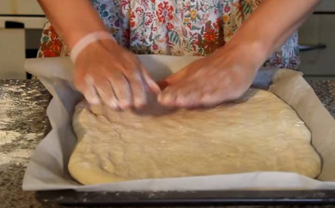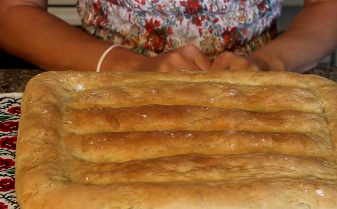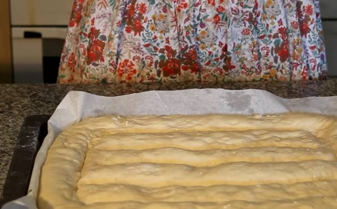 4. Прямоугольную форму мы сделаем из него. Теперь аккуратно перекладываем на противень, застеленный пергаментной бумагой. Бумагу ничем не смазываем и теперь тесто растягиваем по всему протвиню. Должно получиться вот так. Снова накрываем пленочкой и отправляем в теплое место на 20 - 30 минут. Нашли хлебушек подрос, теперь мы немножечко взбрызнем его водичкой. Мокрыми руками сделаем определенные манипуляции. я промяла по кругу а теперь еще по серединке. Теперь отправляем в разогретую до 200-220 градусов духовку на 20 минут. А вот и наш хлебушек. Уверена, он вас действительно удивить.Видео рецепт ютуб ниже 👇