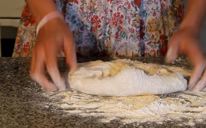 3. Отправляем в духовку на 30 минут и оно опять должно хорошо подняться. Вот такое у нас сейчас тесто. Снимаем пленочку и снова делаем ту же процедуру. Снова его помешиваеми и хорошо выгоняем воздух. Тесто уже очень сильно поменяла структуру, становится мягкой. В этот раз уже тесто не надо хорошо вымешивать, только выгнать воздух буквально минутку и все. Теперь мы это тесто возьмем и скалкой немножечко раскатаем.
