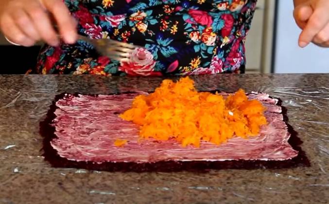 2. Так как для меня она маловата я сделала двойную, то есть одну положила и потом другую. Для того, чтобы все легко у нас получилось я возьму немножечко растительного масла. Аккуратненько растянул его по всей пленочки. Начинаю формировать наш салатик. Выкладываем свеклу на нашу пленочку и аккуратненько все разравниваем. Высота свеклы должна быть около 1 сантиметра не тоньше. Таким прямоугольником выкладываем. Разложила свеклу и надо ее хорошо припресовать. Это удобнее сделать если положить наверх еще одну пленочку и руками прижать. Теперь мы свёколку немножко присаливаем.