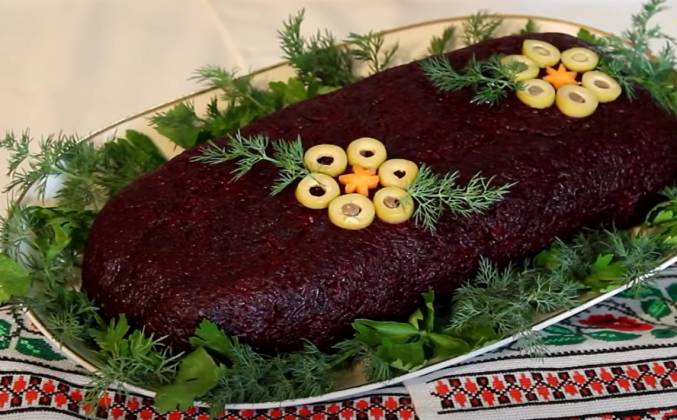 4. Селедка у нас горочкой в центре. Теперь мы уже формируем наш рулет. Берем за пленочку и аккуратненько переворачиваем наш салат до середины. Хорошо прижимаем, чтобы не вылезли нижние слои. И тоже самое делаем с другой стороны, хорошо прижимаем. Теперь наш рулет хорошо затянут пленочкой, я перекладываю аккуратно на досочку и отправляю в холодильник, часа на два, а лучше на ночь, чтобы он настоялся. Мой рулетик пролежал 2 часа в холодильнике и теперь я буду готовить его для подачи на стол. Дальше украшаем. Вот такой салатик у нас получился. Приятного аппетита!