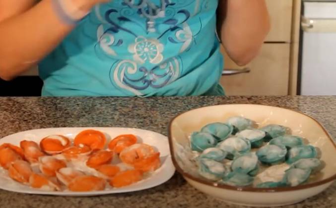 2. Вы своей краской пользуйтесь в соответствии с инструкцией. Добавляю краску прямо в центр и начинаем хорошо вымешивать. Вот до такого цвета я довожу свое тесто и сейчас займусь другим. Теперь его замотаю пленочкой и отправлю холодильник минимум на полчаса. После это с ним будет намного легче работать. И так фарш фарш у меня уже готовый здесь половина рыбы половина кальмара. Теперь нам необходимо очистить чеснок и лук, пропустить это через мясорубку и смешать. По вкусу и присаливаем и приперчиваем. Фарш можно попробовать, чтобы угадать на соль. Пельмени можно лепить с помощью пельменницы или вручную.