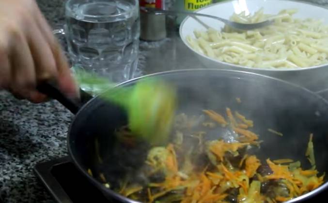 3. Уменьшаем огонь и протушим 5 минут. Так стушилась наша печень с овощами и теперь сюда на сковородку мы добавим макарончики. Перемешиваем и еще оставляем буквально на пару минут. Теперь наши макарончики здесь дойдут с этим соком. И вот такой результат наших стараний очень-очень вкусно и ароматно.Видео рецепт ютуб ниже 👇