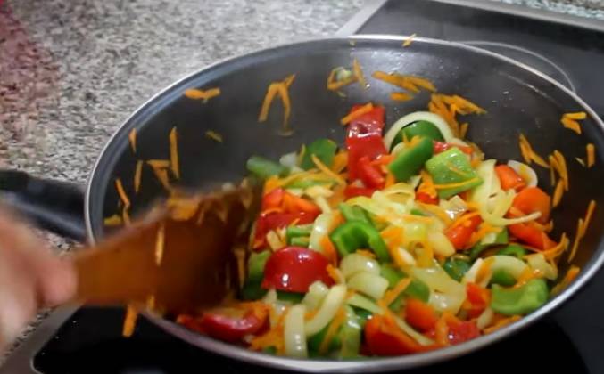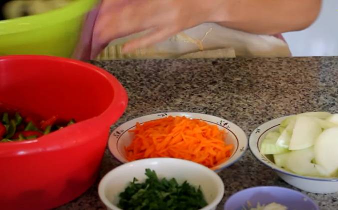 2. Натертый чеснок, нарубленная зелень. сейчас мы наши баклажаны хорошо посолим и где-то на полчаса или час оставим, чтобы они пустили сок .И после чего мы будем их обжаривать. Сейчас мы смешаем перец лук и морковку и слегка протушим, буквально чуть-чуть. И так, наши баклажанчики простояли целый час под солеными, видите сколько сока. Сливаю сок и мы будем обжаривать овощи. На разогретую сковородку с маслом высыпаем наши овощи. Обжаривать будем на сильном огне для того чтобы все смягчилось и пустило сок. Наши овощи уже готовы вот они такие стали , но перчик все-таки еще твердый, не надо его пережаривать - это важно! И так снова сковородка, разогретое масло и жарим баклажаны.