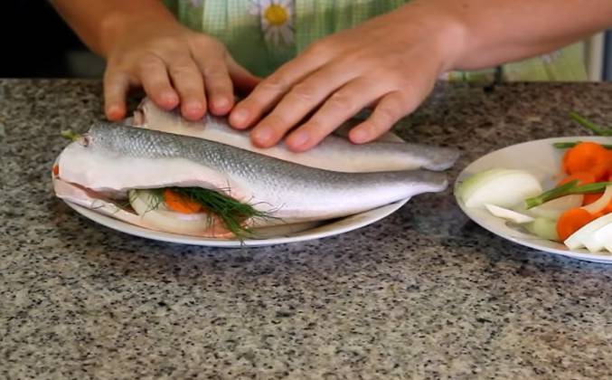 2. Сейчас мы берем лучок и закладываем сюда в животик и закладываем сюда же морковочку. По-больше, морковка будет очень вкусная. Сюда же добавляем веточку зелени. То же самое делаем с другой рыбкой. Теперь мы нашу рыбку укладываем аккуратно на решеточку и сверху добавляем ещё немножечко овощей. Вот такая у нас сейчас рыбка теперь и я ее отправляю на плиту на сильном огне довожу до кипения под плотно закрытой крышкой.