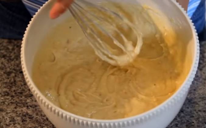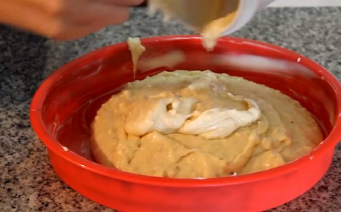 2. Высыпаем орешки и еще раз хорошо перемешали. Теперь постепенно сюда мы будем вводить муку. Консистенция должна быть как густая сметана. Мука у всех разная и будет разное количество. Доводим до ровной консистенции. Такое у нас получилось тесто, достаточно жидкое. Теперь мы берем форму, смазанную сливочным маслом, и сюда его выливаем. Аккуратненько разравниваем.