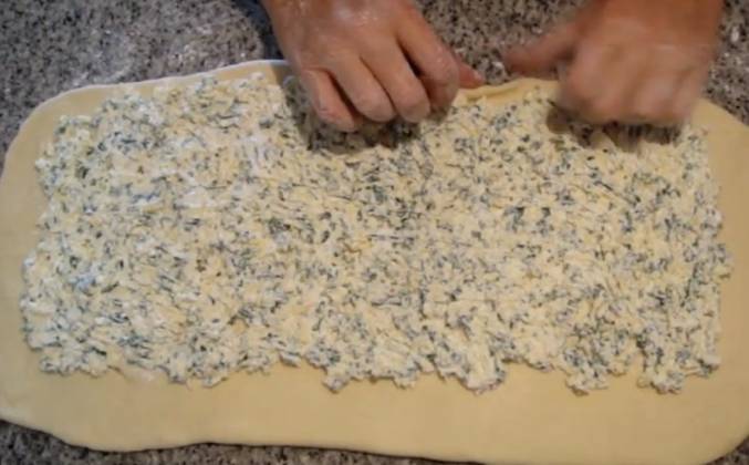 2. Сейчас будем делать что нам сейчас необходимо - творог вилочкой, хорошо размять чтобы он был мягенький. Зелень мелко накрошить и на крупную терочку натереть твердый сыр, все это смешать, хорошо перемешать и посолить. Вот такая начиночка получилось, наше тесто поднялось где-то в два раза. Сейчас мы его видите очень легко просто ем из-за того что была смазанная мисочка. Еще раз немножечко ему обминаем, выпускаем оттуда весь вишни буду так после чего его нужно раскатать такой пласт прямоугольный. Обязательно вот такой пласт у нас получился теперь мы оставим место немножко от края. И вот тут тоже чуть-чуть все остальное мы закладываем ровненько нашу начинку вот так на данном этапе выглядит наша улиточка.