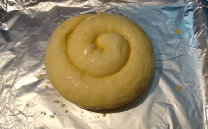 3. И сейчас нам необходимо сделать такую трубочку - все аккуратненько ровномерно скатать сильно стягивать нельзя иначе при выпекании. Тесто порвется вот я скатала - улиточку. А теперь немножечко, и и еще вот так вот прям как бы вытяну, аккуратненько и теперь мы нашу улитку. Будем аккуратненько вот так вот сворачивать, смотрим чтобы внутри она свернулась. Сейчас молочко и все мы смазали яйцом в нашу улиточку. Теперь отправляем ее в разогретую духовку до 180 градусов, приблизительно минут на тридцать, чтобы она хорошо загорелся. Наша улиточка готова - поверьте она очень вкусно пахнет и красиво выглядит.Видео рецепт ютуб ниже 👇