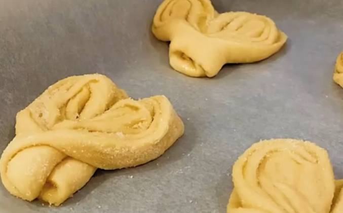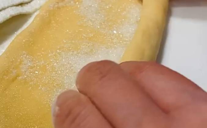 3. Сказываем шарики, каждый шарик раскатываем в прямоугольник, смазываем растопленным сливочным маслом, посыпаем сахаром. Сворачиваем рулет и складываем его пополам. Делаем надрез от середины сложённого рулета и раскрываем сердечко (лучше посмотреть на видео). Убираем сердечки в тёплое место на 20-30 минут. Далее смазываем булочки сливками с желтком и отправляем в духовку на 15-20 мин при 180 гр. Не передержите! а то будут сухие.
