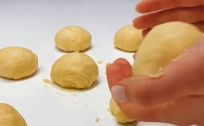 2. Мука у всех разная, может хватить и 500 гр, но а любом случае лучше добавлять муку постепенно при замесе теста. Вымешиваем тесто около 7-8 минут, оно получается мягкое и приятное. Перекладываем тесто в емкость смазанную растительным маслом, накрываем пищевой плёнкой и убираем в тёплое место на 1-1,5 часа. Взвешиваем тесто и разделяем на 12 частей, у меня кусочки теста по 100 гр.