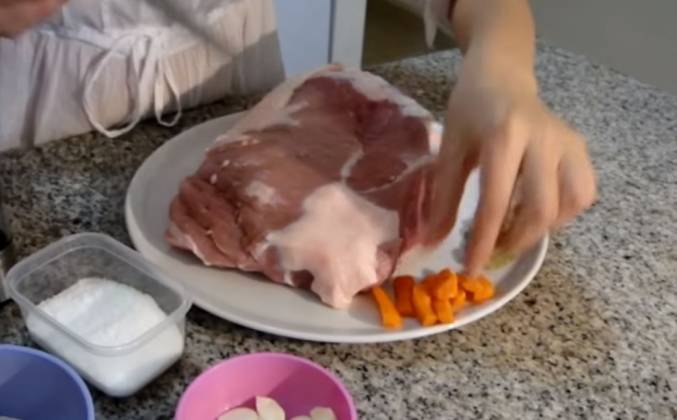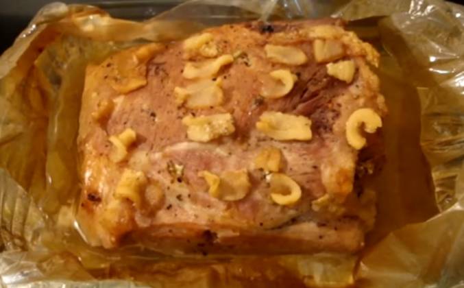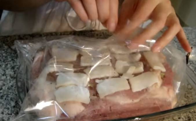2. Это способ мне нравится больше всего. Теперь выкладываем кусочки сала на мясо. Мясо сделается сочным. Сало начнет тает и это заменит процесс того, чтобы вы стояли и поливали мясо ложечкой. Для того чтобы не лопнул наш пакетик мы сделаем иголочкой проколы.