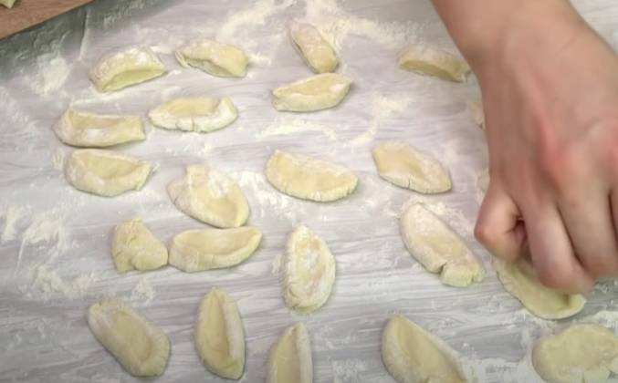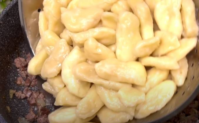 3. Тесто делим на несколько частей, для удобства, берем одну часть и катаем жгутик, режем ножом на медальоны. В кастрюле доводим воду до кипения, воду подсаливаем. Кладем галушки и варим как всплывут минуты 2, больше не рекомендую, так как чем дольше они варятся тем становятся грубее. Откидываем на дуршлаг и добавляем к фаршу. Жарим все вместе пару минут и можно подавать к столу.Видео рецепт ютуб ниже 👇