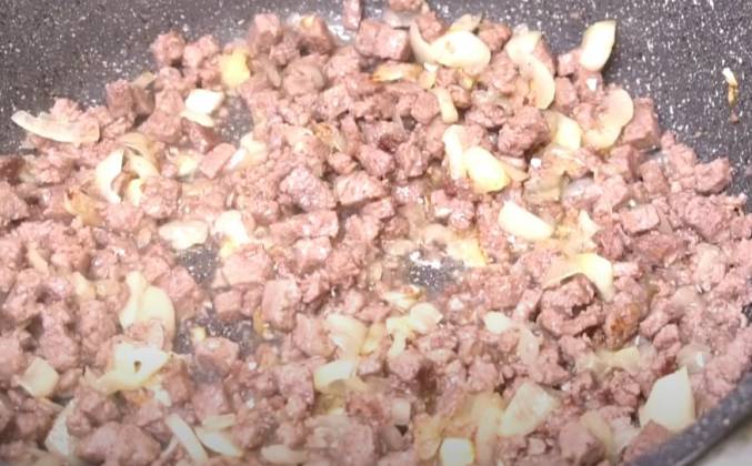 2. В конце замеса, я на руку наливаю 1 ст.л. растительного масла и вмешиваю в тесто. Даю тесту полежать 20 минут. За это время порежем лук, На сковороду наливаем немного растительного масла, кладем фарш и жарим его до испарения жидкости, на отдельной сковороде я обжариваю лук на небольшом количестве масла. Добавляю к фаршу, вливаю воды 150 мл, соль, черный перец, лавровый лист и готовлю фарш до испарения жидкости и готовности фарша.
