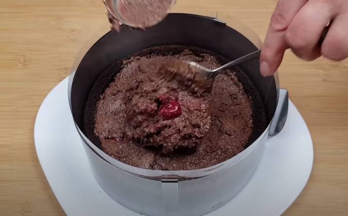 4. Откладываем 1 полную ст. ложку шоколадной массы, ею мы потом обмажем бок торта. 130 граммов замороженной вишни без косточек добавляем в шоколадную массу. Перемешиваем до однородного состояния. Вместо замороженной вишни можно брать свежую вишню без косточек Замороженную вишню заранее размораживать не надо. На тарелку выкладываем бисквитную «корзинку» Устанавливаем разъёмное кольцо и ацетатную плёнку. Заполняем бисквитную «корзинку» шоколадной массой. Перекладываем всю шоколадную массу, равномерно разравнивая. Накрываем торт ранее срезанной «шапкой». Корж слегка придавливаем.