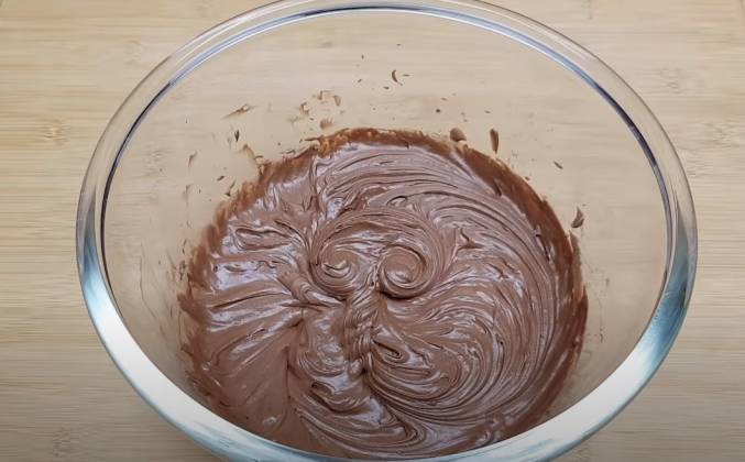 3. Приготовим крем. Растопим в микроволновой печи или на водяной бане 100 граммов чёрного шоколада с содержанием какао 50% Размешаем шоколад до однородного состояния и отставим в сторону 300 грамм сливочного сыра, сливочный сыр в данном рецепте можно заменить мягким пастообразным творогом. Ссылку, как самим приготовить такой творог я оставлю в описание под видео и в подсказках к видео Взобьем сливочный сыр до воздушного состояния. Добавляем 25 граммов просеянного какао И 150 граммов сгущённого молока Перемешиваем до однородного состояния, взбивать не надо. Добавляем 100 граммов ранее растопленного шоколада Перемешиваем до однородного состояния Соберём крем со стенок, перемешаем по дну. Примерно 2/3 от выбранного мякиша, если вы взвешиваете на весах, то я взяла 200 граммов измельчаем в крошку. Добавляем крошку в крем. Перемешиваем, получается очень вкусная шоколадная масса.