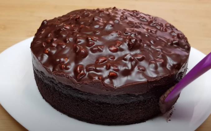 5. Приготовим шоколадную глазурь. К 50 граммов сливочного масла, для удобства я масло нарезала кусочками. Добавляем 50 граммов или мл молока И 100 граммов измельчённого чёрного шоколада с содержанием какао 50% Нагреем всё вместе в микроволновой печи или на водяной бане. Сливочное масло и шоколад должны растопиться. Перемешаем всё вместе до однородного состояния. В шоколадную глазурь высыпаем 50 граммов измельчённого обжаренного арахиса Перемешиваем до однородного состояния. Вместо арахиса можно брать любые орехи, которые вы любите. Равномерно покроем торт глазурью. Убираем торт в холодильник, чтобы он пропитался и стабилизировался, на 5-6 часов. Можно убрать торт в холодильник на ночь. Готовый торт освобождаем от формы и плёнки. Обмазываем бок торта ранее отложенной шоколадной массой. Торт готов, можно подавать торт к столу.Видео рецепт ютуб ниже 👇