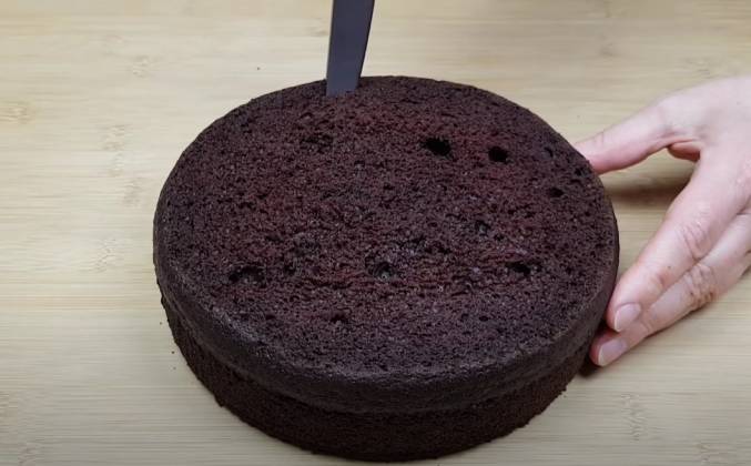 2. У меня бисквит выпекался 65 минут. Время выпечки зависит от размера формы, в которой вы будете выпекать и температуры в духовке. Готовность пирога проверяем деревянной палочкой прокалываем, если она выходит сухая, без остатков мокрого теста, значит пирог готов Вынимаем бисквит из духовки и даём ему остыть в форме минут 15 – 20. Далее аккуратно пройдём ножом по краю формы Освобождаем от формы Перекладываем бисквит на решётку и даём ему остыть до комнатной температуры. У остывшего бисквита выравниваем верхушку. Если надо, срежте сухие корочки. Далее срезаем «шапку». Я прорезаю контур по краю ножом. В разрез вставляю нить и нитью разрезаю бисквит. Срезанной «шапкой» мы в конце накроем торт. Из нижнего бисквита аккуратно выберем всю мякоть Для этого проведём ножом по окружности бисквита на расстоянии 1,5 см от края И ложкой выберем мякоть. Оставив бортики и дно толщиной примерно 1,5 см. Вот такая бисквитная «корзинка» должна получится.