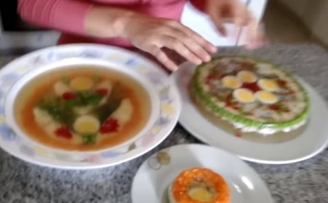 3. Возьмем от него буквально 0,5 литра для того чтобы в нем развести желатин. После того как желатин разведем выливаем все обратно и аккуратненько помешиваем. Теперь в формы выкладываем кусочки рыбы кусочки овощей и заливаем бульоном. Охлаждаете и отправляйте в холодильник. Такая красота у нас получилась Эту мы заливали в тарелочку. Другие формочки мы брали силиконовые. Можно использовать большие маленькие формы. Делайте так как вам нравится! Угощайте своих друзей, гостей. Приятного аппетита!Видео рецепт ютуб ниже 👇