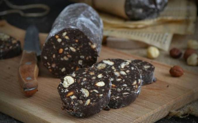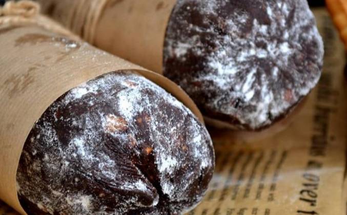 3. Ну и всё, угощение к утреннему чаю готово. Если сделать шоколадную колбасу в подарок, то для большей правдоподобности, её (застывшую!) можно обвалять в сахарной пудре и обернуть в пергаментную бумагу или перевязать шпагатом.