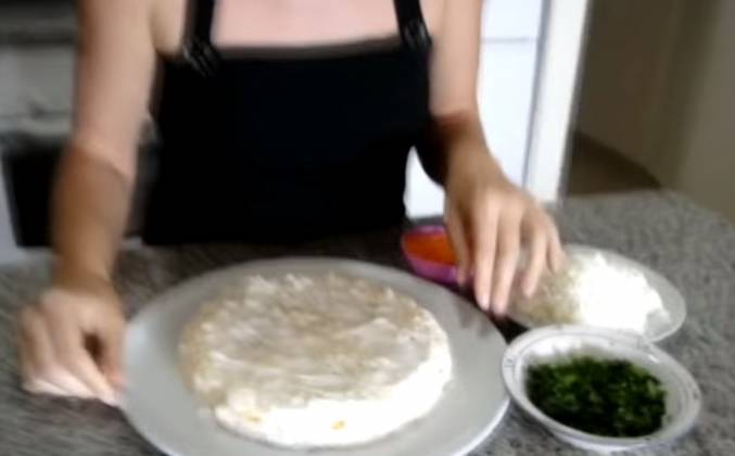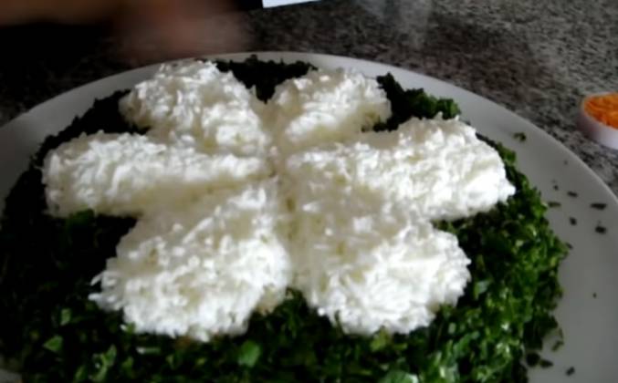 3. Для декорации этого салатика на нем мы нарисовали лепесточки ромашки. Сначала мы потрусили зеленью. Потом будем белок и только потом уже будем использовать морковочку. Вот появляется ромашка нашим салате. Теперь ставим центр. Для этого мы берем крышечку от воды и плотненько набиваем туда морковку и после чего ее ставим. Салат готов.Видео рецепт ютуб ниже 👇