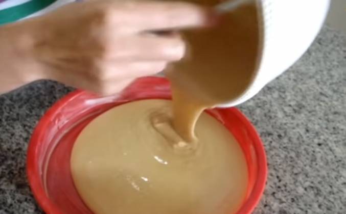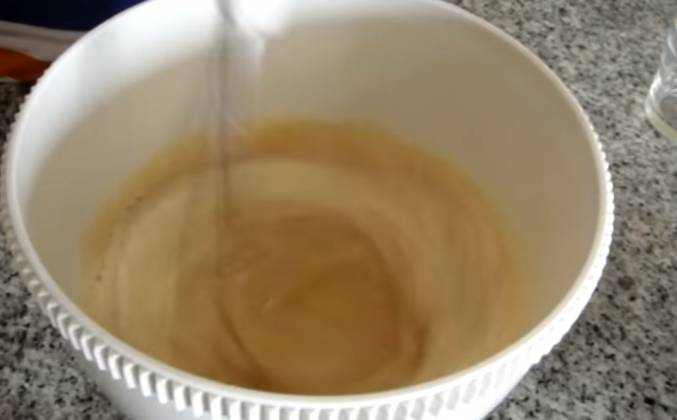 2. Перемешиваем и теперь муку постепенно отправляем сюда и хорошенько его перемешиваем. Наше тесто должно получиться как густая сметана. Так как мука абсолютна разная, потому иногда надо добавлять немного. Хорошенько вымешиваем. Такое тесто у меня получилось, нету никаких комочков и такая т у него густота.