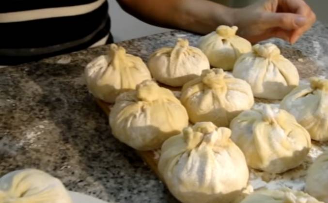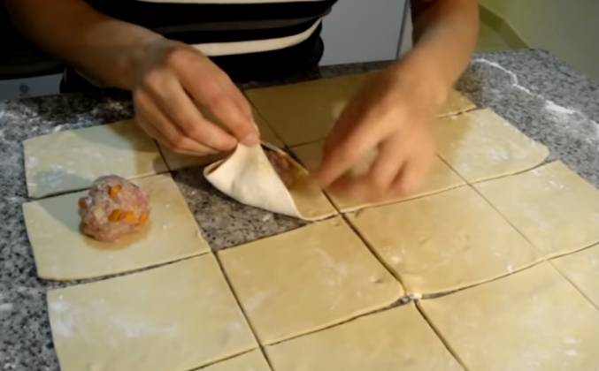 2.  Я раскатала тесто очень тоненько один-два миллиметра толщиной. Разрезала на квадраты. Квадраты приблизительно должны быть 10 на 10 сантиметров. Теперь положила в центр каждого квадрата кусочек фарша. Размером с куриное яйцо и теперь мы защипываем уголочки и соединяем. Хорошо защипываем и проходим здесь все раз-раз-раз-раз и вверх защипываем и поднимаем вверх защипываем и вверх. Такие мешочки у нас получились. Наши манты вот так выглядят. Теперь их отправляем в пароварку.