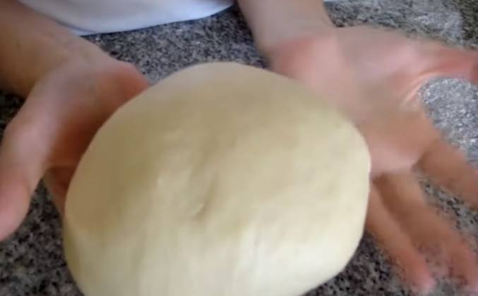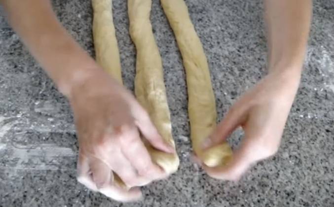 3. Тесто выкладываем на стол, смазанный мукой и несколько минут хорошо вымешиваем, чтобы оттуда ушел весь воздух. Тесто разделили на три части. Сейчас мы будем делать плетенку. Для чего нам надо каждый кусочек раскатать колбаску одинаковые по толщине. Наши колбаски готовы. Теперь будем лепить косичку. Нам надо все соединить. Соединили помяли и вот так вот немножечко его перекрутили. И теперь начинаем делаем косичку. Смотрим, чтобы косичка симпатичная получилась. Плетется очень легко. Доплели до конца и все это склеили. Хорошенько, чтобы она потом не развернулась. Выравниваем булочку.
