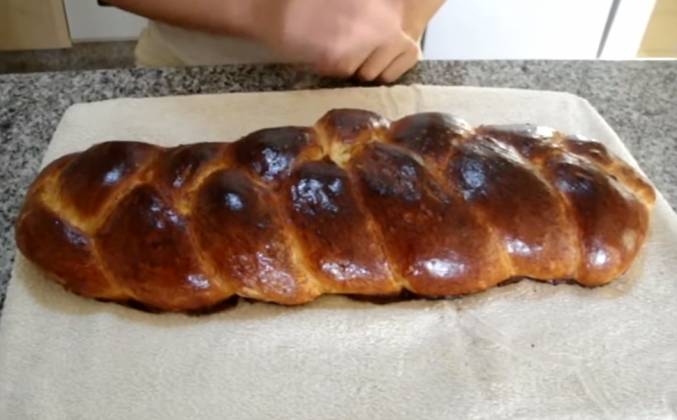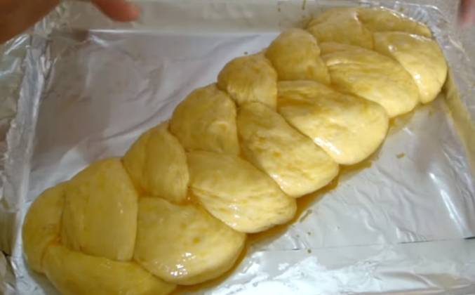4. Берем противень, который я смазала растительным маслом и аккуратненько нашу косичку переносим на противень. Теперь мы ее должны накрыть пищевой пленкой и так оставить еще на 1 час. Пленку обязательно нужно применить, иначе косичка подсохнет и не сможет расти. Периодически пленку приподнимаем, как бы даем место чтобы тесто росло. Такая булочка у нас получилось через 1 час. Сейчас мы должны ее аккуратненько смазать яйцом. Желток яичный плюс молоко я хорошо сбила. Смазываю плетенку и отправляю в духовку разогретую до 180 градусов минимум на 20 минут, чтобы булочка так хорошо подрумянилась. Наша булочка смазана и отправляем в духовку. Такая булочка у нас вышла из духовки. Моя семья просто обожает.Видео рецепт ютуб ниже 👇