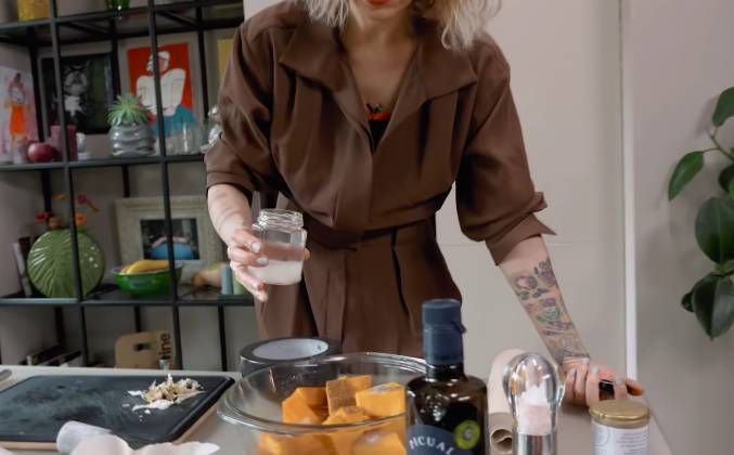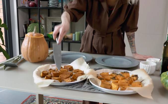 2. Это чили-перец, он очень острый; старайтесь даже не дышать, когда его насыпаете. Всё, этого будет достаточно. Я, пожалуй, не буду мешать это руками, а возьму ложку. Выкладываем и теперь ставим оба этих противня в разогретую духовку на 180-200 градусов и на режим «гриль». Причем, ставим таймер на 20 минут и тот, что сверху, потом меняем с нижним местами для того, чтобы они равномерно запекались. Всего нам нужно около сорока минут запекания. Ну что, пока наша тыква запекается, идем со мной на улицу я покажу, как я украсила террасу тыквенным декором. Вот такие ребята у меня получились при помощи обычной гуаши, которая продается в любом магазине для творчества.