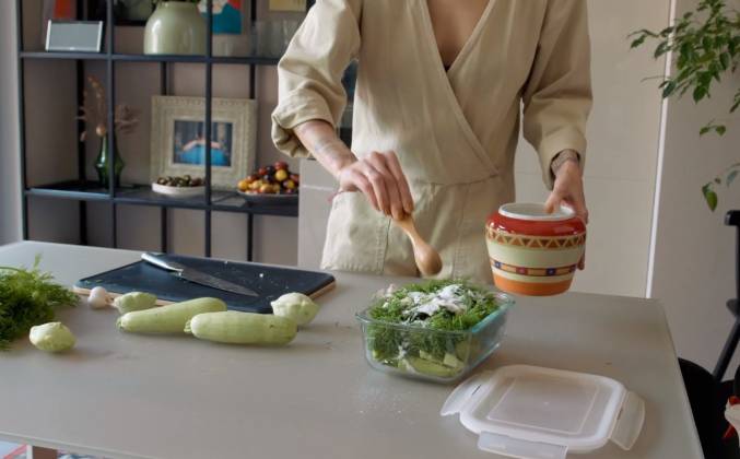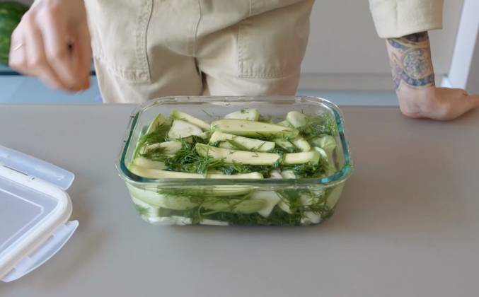 2. Я всегда стараюсь упрощать все кухонные процессы там, где это возможно. В данном случае чеснок и укроп нужны нам только для маринада, есть мы их не будем. По крайней мере пока не закончатся кабачки и патиссоны. Теперь солим. И последнее действие. Мы берем сильногазированную воду, это прям важный момент, и заливаем теперь всё это сильногазированной водой, а потом сразу закрываем вакуумной крышкой, чтобы газики не вышли.