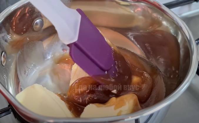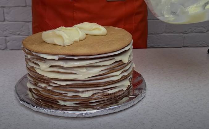 5. На мой взгляд заварной крем идеально быстрый, из самых простых продуктов и всегда вкусный! Под нижний корж для фиксации кладем ложку крема, затем смазываем каждый кремом (по три столовых ложки примерно), если будете промазывать коржи меньшим количеством крема, то торт тоже получится, но более сухой - это уже на ваш вкус! При сборке на коржи сильно не давите, чтобы не выдавливать крем. Не смотрите на то, что торт достаточно высокий, после пропитки он немного станет ниже и будет нужной высоты. Смазываем кремом верх медовика и бока, вставляем пергамент по краям, чтобы подложка осталась чистой. Этого количество крема как раз хватает на весь торт. В завершении обсыпаем торт медовой крошкой, убираем пергамент, оставляем торт для пропитки примерно на 6-8 часов, обычно оставляю на ночь. Торт медовый 6,5 см в высоту 20 см в диаметре и вес - 2,2 кг. Аромат фантастический, хорошо пропитаны коржи, нежный, мягкий... медовый, вкусный! Да вы и сами все видите.Видео рецепт ютуб ниже 👇