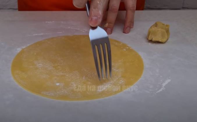 3. Круг теста накалываем вилкой, чтобы поднимался равномерно и кладём на обратную сторону противня (так удобнее). Духовка разогрета на 200 градусов. Цельсия, выпекаем первый корж примерно 7 минут следующие коржи пекутся быстрее, достаточно будет 5 минут. Пока один корж в духовке, раскатываем второй, чтобы не терять время так как коржи пекутся быстро. Первый зарумянился! Достаем, кладем на ровную поверхность, немного остудим. Второй сразу же в духовку и на третьем пергаменте раскатываем третий корж. Первый корж снимаем с пергамента, вот какой у нас получился: твердый, легкий и пористый, после смазывания кремом он станет нежным и мягким. С пергамента снимаем остатки теста и на нем же раскатываем уже четвертый корж, таким образом, испечем 14 коржей (4 у нас получится из обрезков) Остатки теста выпекаем целым коржом, использовать его будем для крошки. 15 большой корж ломаем, измельчаем. Если у вас нет такого измельчителя, можете воспользоваться пакетом и скалкой.