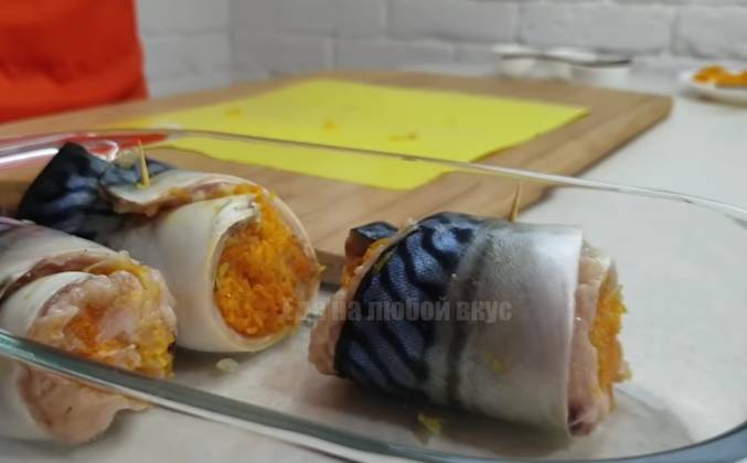 2. Желатин помогает держать форму после остывания. Распределяем по середине овощи, сворачиваем закрепляем шпажкой, поправим начинку Раскладываем рулеты из скумбрии в форму для запекания, предварительно смазанную немного растительным маслом. Запекаем при температуре 200 градусов Цельсия, 25-30 минут Время зависит от формы и размера скумбрии.