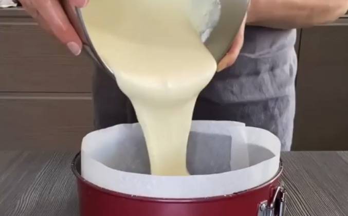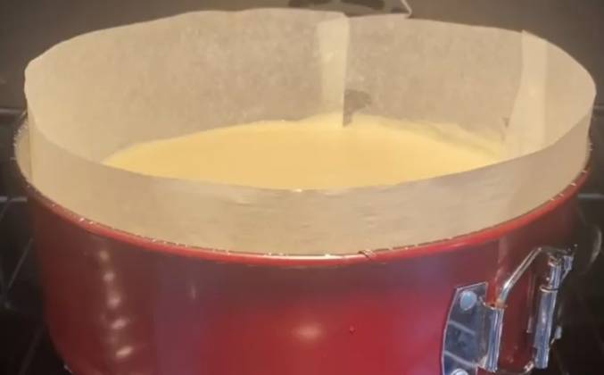 2. Вливаем сырную смесь. Ставим в разогретый до 200° духовой шкаф на 35 - 40 минут. При готовности, если постучать по форме, то середина будет подрагивать! При выпечке наш чизкейк хорошо поднялся, но потом он опустится, так и должно быть!