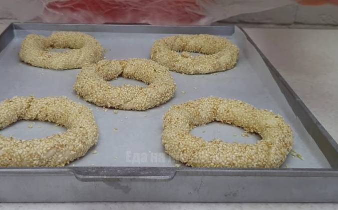 3. Кусочек теста раскатываем в тонкий равномерный жгут, складываем пополам и перекручиваем. Края тщательно слепим. Пока сделаю 5 бубликов на один противень. Затем будем формовать остальные. Теперь берем. Симиты, окунаем их в медовую воду, а затем полностью обваливаем в кунжуте. Кладем на расстоянии друг от друга на тот же противень. Накрываем, оставляем на 30 минут перед выпечкой. Они должны хорошо подрасти. Следом можно готовить 2 противень. Также размещаю на нем 5 бубликов. Пока у нас первые испекутся, эти как раз подойдут. Выпекаем в духовке при температуре 180 градусов по. Цельсию, примерно 20-25 минут до золотистого верха. Сразу их перекладываем на решетку, чтобы не намокли снизу. Посмотрите, какие они аппетитные! Аромат конечно не передать, но он волшебный. Давайте скорее посмотрим, что получилось. Выпечка мягкая, с хрустящим верхом! Внутри пористый воздушный мякиш. В меру сладкие, а кунжут придает особый вкус!Видео рецепт ютуб ниже 👇
