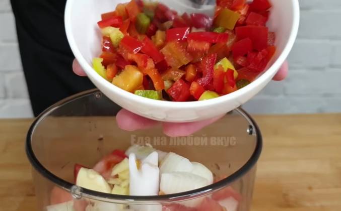 2. Небольшой помидор нарезаем произвольно, следом измельчаем пару зубчиков чеснока, и маленькую луковицу (точный вес ингредиентов под видео) Овощи кладем в блендер, добавляем сладкий перец. Сюда же добавьте острый перец, если любите острое. Овощи измельчаем в блендере не очень мелко, пусть остаются небольшие кусочки. Измельченные овощи добавляем к фаршу, обычно используют баранину. Также в начинку добавляем нарезанную зелень - это петрушка, для цвета добавляем томатную пасту, для сочности и жира немного сливочного масла. Из специй здесь черный перец молотый, всыпаем 1 ч.л. молотой паприки сладкой и солим по вкусу.